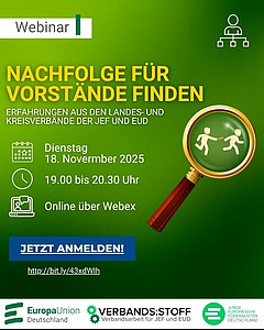 Die Europa-Union Deutschland (EUD) ist die größte Bürgerinitiative für Europa in Deutschland. Unabhängig von Parteizugehörigkeit, Alter und Beruf engagieren wir uns für die europäische Einigung. Wir sind auf lokaler, regionaler, nationaler und europäischer Ebene aktiv. Die EUD vernetzt 17.000 Europabegeisterte in 16 Landesverbänden und 300 Kreis-, Orts- und Stadtverbänden. Unsere Partnerorganisationen bestehen in über 30 Ländern Europas.